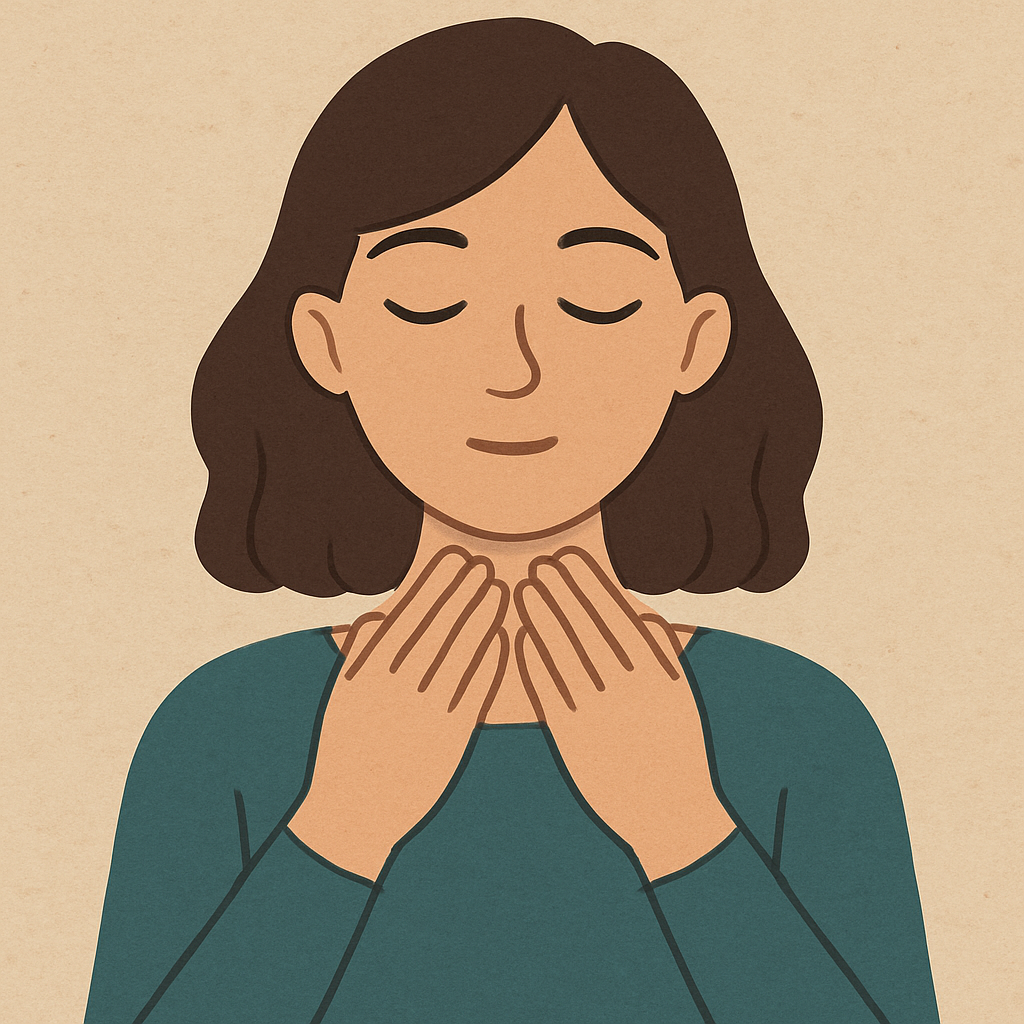 Place your hands on your throat, being mindful of your breathing. This position can help with communication and expression.