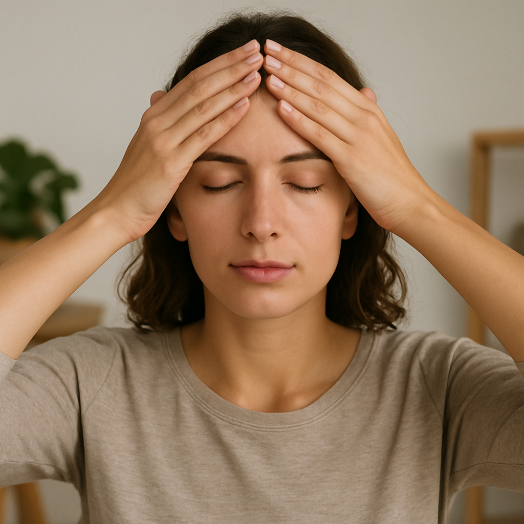 Move your hands to rest gently over your eyes or on your temples. This position can help relieve tension and stress.